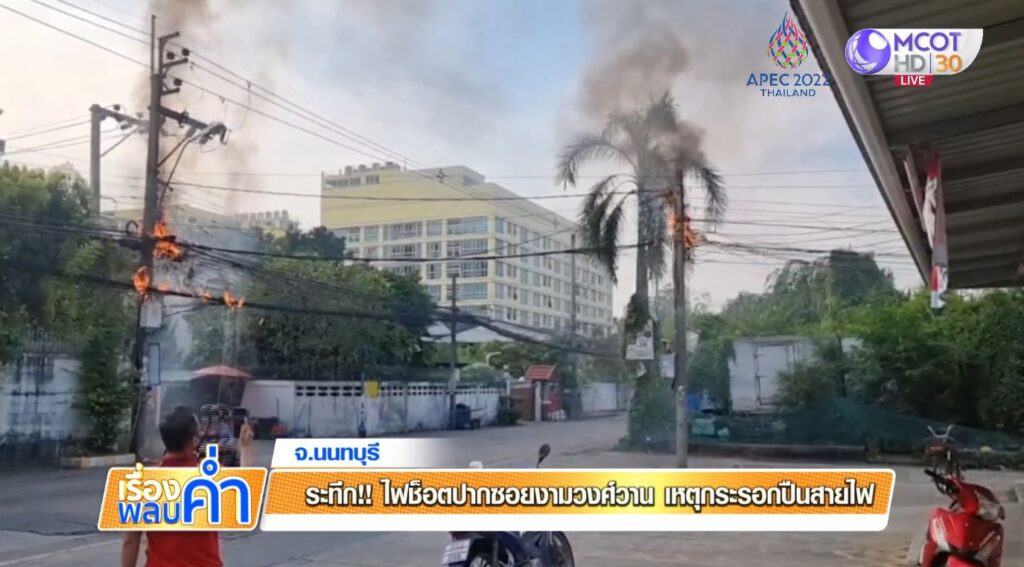 ที่บริเวณปากซอยงามวงศ์วาน 27/6 อ.เมือง จ.นนทบุรี เกิดเหตุไฟลุกไหม้ที่บริเวณเสาไฟฟ้าโดยไฟได้ลุกลามจากสายสื่อสารขึ้นไปยังสายไฟฟ้า ทำให้สายไฟฟ้าเกิดการช็อตเป็นประกายไฟออกมาเป็นระยะ ลุกไหม้ลามเสาไฟฟ้าอีกต้นหนึ่งซึ่งอยู่หน้าร้านสะดวกซื้อ โดยระหว่างที่เกิดเหตุไฟลุกไหม้ไฟฟ้าและสายสื่อสาร นายผดุงศักดิ์ พันต่าย เจ้าหน้าที่ไฟฟ้าเขตนครหลวง ขี่รถจักรยานยนต์ผ่านมาพอดี จึงได้เข้าช่วยดับไฟที่กำลังลุกไหม้สายสื่อสารบนเสาไฟฟ้าทั้ง 2 ต้น ด้วยการนำถังดับเพลิงประเภทน้ำยาเคมีดับไฟมาช่วยฉีดสกัดไฟที่กำลังลุกลามไปตามสายสื่อสาร พร้อมประสานเจ้าหน้าที่การไฟฟ้าส่วนภูมิภาคให้ตัดกระแสไฟบริเวณดังกล่าว เนื่องจากไฟลุกไหม้ไปติดสายไฟฟ้าบางส่วนจนสายขาดร่วงลงมาที่พื้นถนน เกรงว่าจะเกิดอันตรายกับผู้สัญจรผ่านเส้นทาง นอกจากนี้ได้ประสานรถดับเพลิงเทศบาลนครนนทบุรี เข้าฉีดน้ำเพื่อดับไฟด้วย ใช้เวลาประมาณ 15 นาที สามารถควบคุมเหตุการณ์ทั้งหมดเอาไว้ได้. -สำนักข่าวไทย