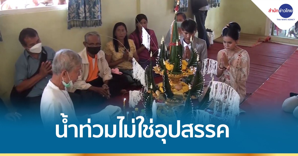 อุปสรรคใด ๆ ก็มิอาจขวางกั้นความรักของบ่าวสาวคู่นี้ได้ โดยภาพของชาวบ้านที่นั่งเรือไปร่วมงานแต่งของบ่าวสาวในตำบลคำน้ำแซบ อำเภอวารินชำราบ จังหวัดอุบลราชธานี เรื่องราวมีว่า น.ส.อารีญา กิตติสน หรือ “น้องมิ้น” เจ้าสาว ชาวบ้านช่างหม้อ ต.คำน้ำแซบ อ.วารินชำราบ และนายณัฐวัฒน์ ทองชุม เจ้าบ่าวหนุ่มชาวอำเภอเขื่องใน ซึ่งพบรักกันตั้งแต่เป็นพนักงานอยู่ห้างสรรพสินค้าแห่งหนึ่งในจังหวัดเมื่อปีก่อน จึงหาฤกษ์หายามเพื่อสร้างครอบครัวร่วมกัน แต่ก่อนถึงฤกษ์ยามเข้าพิธีวิวาห์ ที่บ้านเจ้าสาวชุมชนช่างหม้อประสบปัญหาแม่น้ำมูลล้นตลิ่งไหลท่วมบ้าน ตั้งแต่ปลายเดือน ก.ย.และท่วมนานกว่า 1 เดือน จนระดับน้ำเริ่มลดลงจนเห็นบ้านโผล่พ้นน้ำและถือฤกษ์ที่ได้ตระเตรียมไว้ อุปสรรคของบ่าวสาว คือ บ้านกลายเป็นเกาะกลางแม่น้ำ ถูกน้ำท่วมล้อมรอบ ถนนและบ้านเรือนในชุมชนส่วนหนึ่งยังถูกน้ำท่วม จึงตัดสินใจแต่งงานกลางน้ำท่วม ตามที่ได้เชิญแขกเหรื่อไว้ งานนี้จึงไม่ใช่แค่บ่าวสาวที่ฝ่ากระแสน้ำมาตามฤกษ์ แขกก็ต้องนั่งเรือฝ่ากระแสน้ำมาด้วย สุดท้ายงานจบลงด้วยดี แขกที่มางานแต่งถึงกับออกปากว่าเป็นประสบการณ์ครั้งหนึ่งในชีวิต อยู่มาอายุกว่า 50 ปี เพิ่งเคยนั่งเรือฝ่าน้ำเชี่ยวมางานแต่ง. -สำนักข่าวไทย
