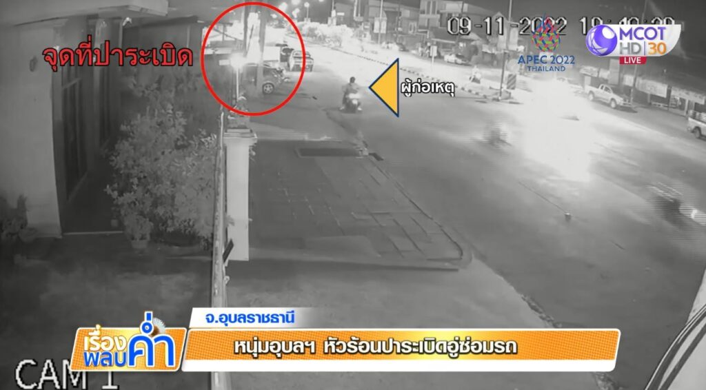 น.ส.พันทิวา พลเรือ อายุ 38 ปี เจ้าของอู่ เปิดเผยว่าเวลาประมาณ 19.38 น.จากกล้องวงจรปิด เห็นวัยรุ่นขับขี่มอเตอร์ไซค์มาจอดก่อนถึงอู่ประมาณ 20 เมตร จากนั้นเปิดใต้เบาะ ภาพวงจรปิดพบว่าเป็นขวดน้ำมันจากนั้นก็เดินมาจุดไฟที่บริเวณด้านหน้าอู่ก่อนโยนเข้ามาในอู่นับจำนวน 6 ขวด จนไฟลุก หลังช่วยกันดับไฟ ตรวจพบความเสียหายประมาณ 150,000 บาท ส่วนสาเหตุน่าจะเกิดจากลูกกค้าที่ทิ้งรถไว้ให้ซ่อม แต่อู่ติดต่อไม่ได้ จึงยังซ่อมไม่เสร็จ และหากลูกค้าจะเอารถไปต้องจ่ายค่าบริการเบื้องต้นประมาณ 1,000 บาท และค่าอะไหล่ที่เปลี่ยนให้แล้ว 1,500 บาท ก่อน จึงตกลงกันไม่ได้ ในเย็นวันเกิดเหตุ จากนั้นช่วงค่ำก็มีการปาระเบิดที่อู่