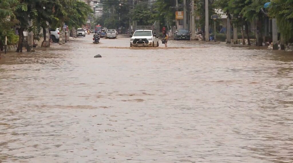 เชียงใหม่ 7 ต.ค. – จ.เชียงใหม่ แม้ระดับน้ำลดลงบ้างแล้ว แต่ยังมีฝนตกลงมาซ้ำเติม อย่างถนนช้างคลาน ย่านเศรษฐกิจและที่ตั้งของโรงแรมหลายแห่ง ยังคงมีน้ำท่วมขังสูง 30-50 ซม. ตลอดทั้งสาย รถเล็กสัญจรลำบาก