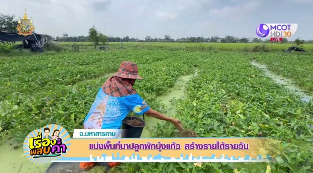 มหาสารคาม 15 ต.ค. – แบ่งที่นาข้าวปลูกผักบุ้งแก้ว แค่ 3 งาน เก็บขายมีรายได้ทุกวัน แถมเศษผักบุ้งจากการตัดส่งขาย ยังใช้เป็นอาหารลดต้นทุนในการเลี้ยงปลา เงินเหลือเก็บออมได้อีก