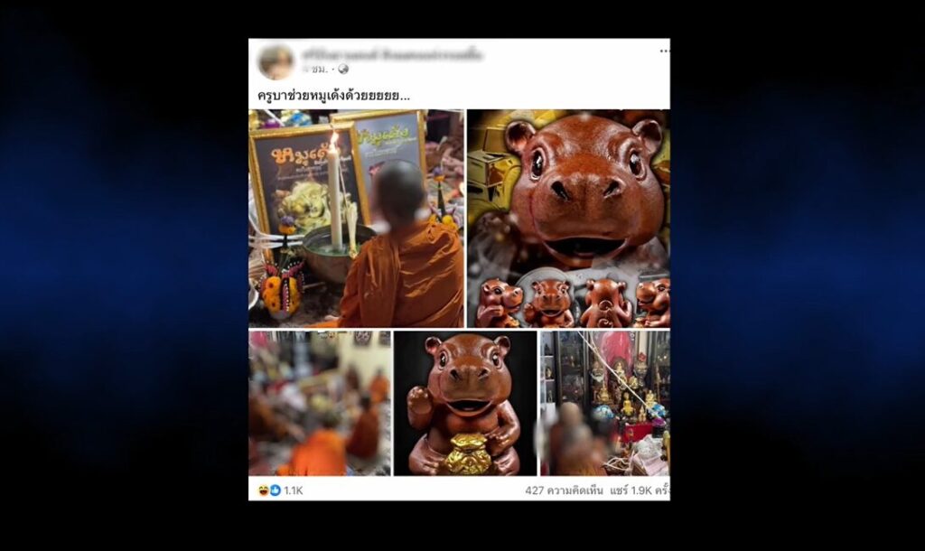 ภาพนี้ถูกแชร์กันในโซเชียล ขณะที่พระสงฆ์นั่งทำพิธีปลุกเสก “ฮิปโปกวักทรัพย์” ซึ่งจะเห็นรูปหล่อ “หมูเด้ง” ฮิปโปแคระ เพศเมีย ที่กำลังเป็นซุปตาร์ของสวนสัตว์เปิดเขาเขียว จังหวัดชลบุรี แต่ประเด็นนี้ก็มีหลายคนมองว่าไม่เหมาะสม โดยเฉพาะพระมาร่วมพิธีปลุกเสกเสียเอง