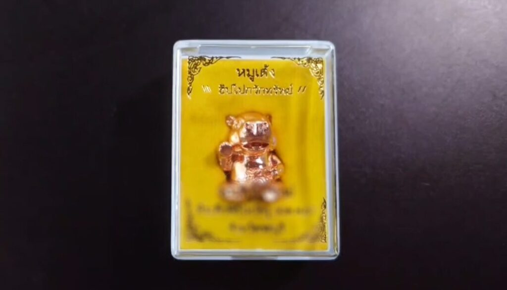 ผู้สื่อข่าวไปที่สำนักสงฆ์แห่งหนึ่ง ต.ห้วยใหญ่ อ.บางละมุง จ.ชลบุรี พบพระอาจารย์ซึ่งเป็นผู้ทำพิธีปลุกเสก เล่าว่า ก่อนหน้านี้ ผู้จัดสร้างที่เคยทำเครื่องรางโดราเอมอน ปรึกษาว่าจะสร้างรูปหล่ออะไรดี จึงมีแนวคิดทำหมูเด้งขึ้นมาเพรากำลังนิยม และหวังให้คล้ายกับแมวกวักญี่ปุ่น จึงทำ “ฮิปโปกวักทรัพย์” เป็นเครื่องรางน่ารักๆ ซึ่งทางทีมงานขอให้พระอาจารย์จารแผ่นยันต์และปลุกเสกตามประเพณี ยืนยันว่าไม่ได้มีการปลุกเสกหมูเด้งภายในวัดแต่อย่างใด แต่ไปปลุกเสกที่บ้านของผู้จัดสร้าง และนำมาแจกในพิธี