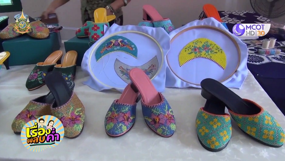 รองเท้าลูกปัดมีลวดลายหลากหลาย สีสันสวยงาม คุณภาพดี มีทั้งลายดอกไม้ นก ผีเสื้อ และผลไม้ โดยรองเท้าลูกปัดจะเป็นรองเท้าหนังประกอบกับขั้นตอนการทำที่ละเอียดละเมียดละไม ใช้เวลาทำ 1 คู่ ประมาณ 15-20 วัน เพราะการเพ่งสายตาในการปักไม่สามารถทำได้นานเกิน 2 ชั่วโมง ต้องพัก