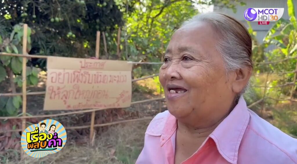 หลังๆ ถูกขโมยมากขึ้นเรื่อยๆ จนแทบหมดต้น ลูกชายจึงทำรั้วกั้นและติดป้ายประกาศเตือน หากใครอยากกิน มาขอกินกันดีๆ อย่ามาขโมย แต่ต้องรอให้ผลมะม่วงแก่เต็มที่ก่อน จะได้รสชาติหวานมัน. – สำนักข่าวไทย