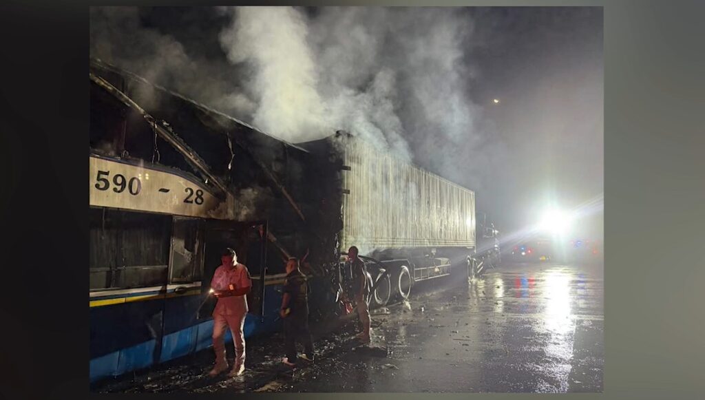 ปราจีนบุรี 21 เม.ย. – รถทัวร์โดยสารชนท้ายรถบรรทุกเทรลเลอร์ บนถนนสาย 304 จังหวัดปราจีนบุรี ทำให้ไฟลุกไหม้รถทัวร์โดยสาร เบื้องต้นมีรายงานผู้เสียชีวิตและผู้บาดเจ็บจำนวนมาก