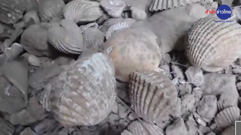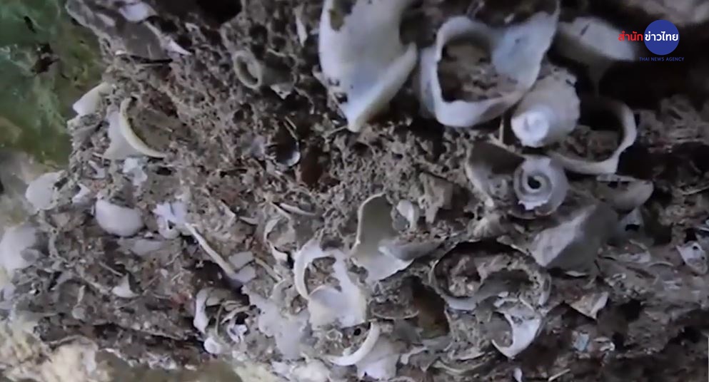 จากการสำรวจบริเวณเพิงผาขาว พบเปลือกหอยหลากหลายชนิด หอยแครง หอยจุ๊บแจง หอยกาบ หอยชักตีน หอยเปลือกหนา ซึ่งเป็นหอยน้ำเค็ม และพบเปลือกหอยกัน หรือหอยภูเขา ซึ่งเป็นหอยน้ำจืด กองอยู่บนพื้นจำนวนมาก เป็นทางยาว รวมทั้งติดอยู่ตามผนังและเพดานถ้ำ แสดงให้เห็นถึงร่องรอยทางธรณีวิทยาที่เกิดการเปลี่ยนแปลงในบริเวณนี้