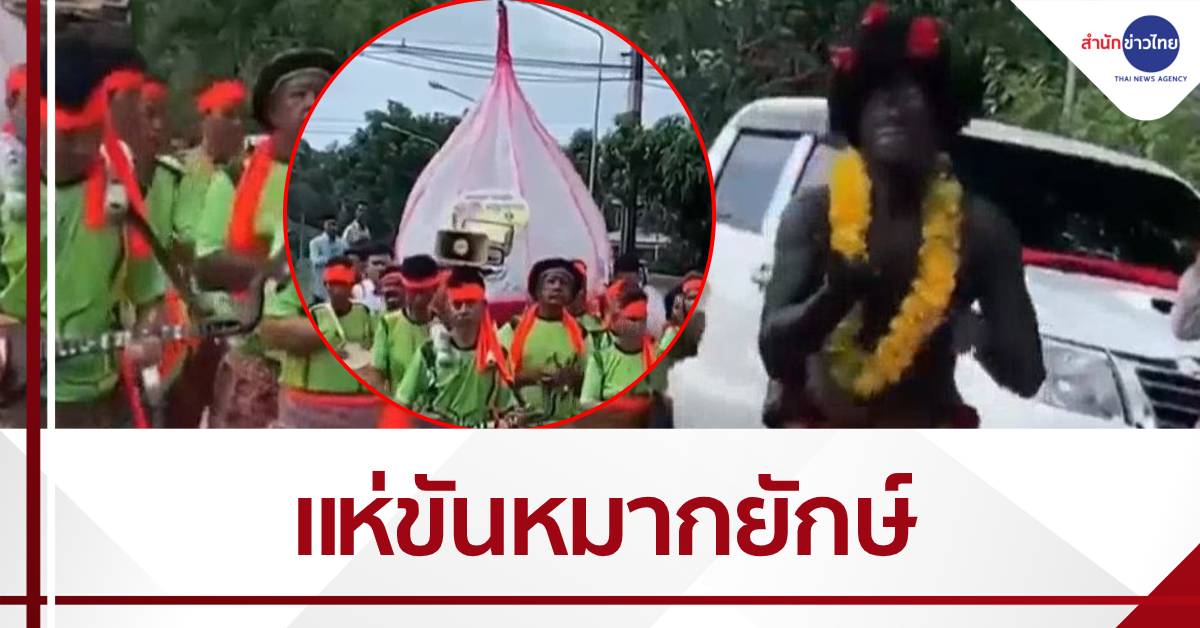 ครึกครื้นตั้งแต่ขบวนแห่ขันหมาก โดยมีญาติเจ้าบ่าวแต่งหน้าแต่งตัวเป็นเงาะป่า ร้องรำนำขบวนพร้อมยกขันหมากยักษ์ไปขอเจ้าสาว เจ้าบ่าวของงานนี้ คือ นายศรายุทธ นวลศรี อายุ 26 ปี เป็นนักธุรกิจ อยู่ที่ อ.เมืองตรัง ส่วนเจ้าสาว คือ น.ส จิรัญญา อินท่าม อายุ 27 ปี ครูสาวโรงเรียนเอกชนแห่งหนึ่งในอำเภอเมืองตรัง ซึ่งนอกจากสินสอดทองหมั้นที่นำมาสู่ขอเจ้าสาวแล้ว สีสันของงานนี้ คือ ขันหมากยักษ์ มีความสูงประมาณ 2 เมตรครึ่ง กว้างกว่า 1 เมตร นับเป็นขันหมากที่ใหญ่ที่สุดเท่าที่เคยมีมา ภายในบรรจุขนมขบเคี้ยว จำนวน 480 ชิ้น เตรียมไว้แจกแขกเหรื่อที่มาร่วมงานได้ติดไม้ติดมือกลับบ้านด้วย
