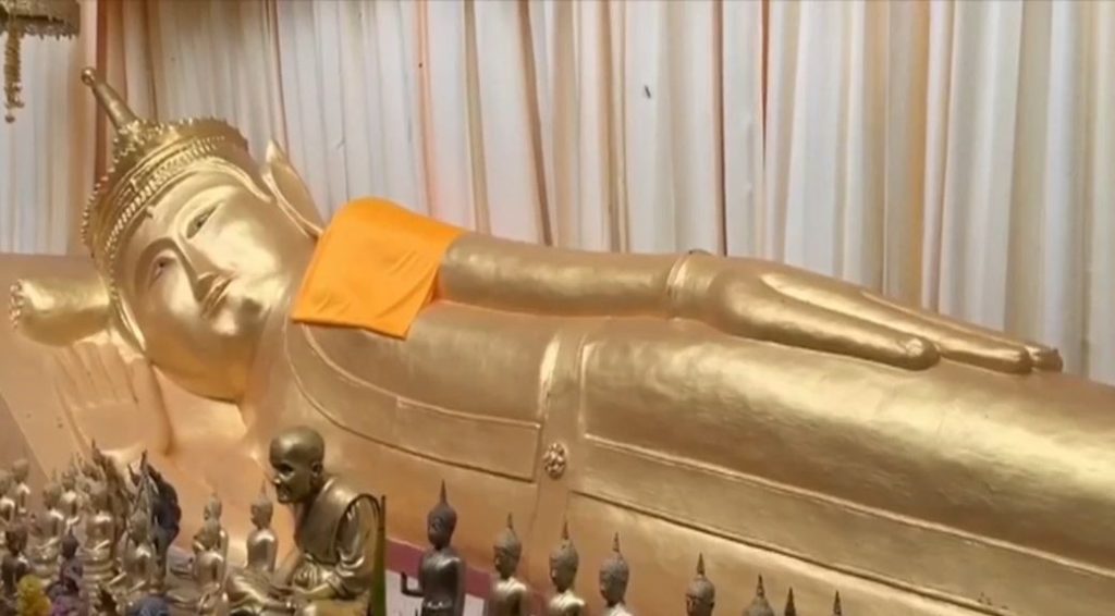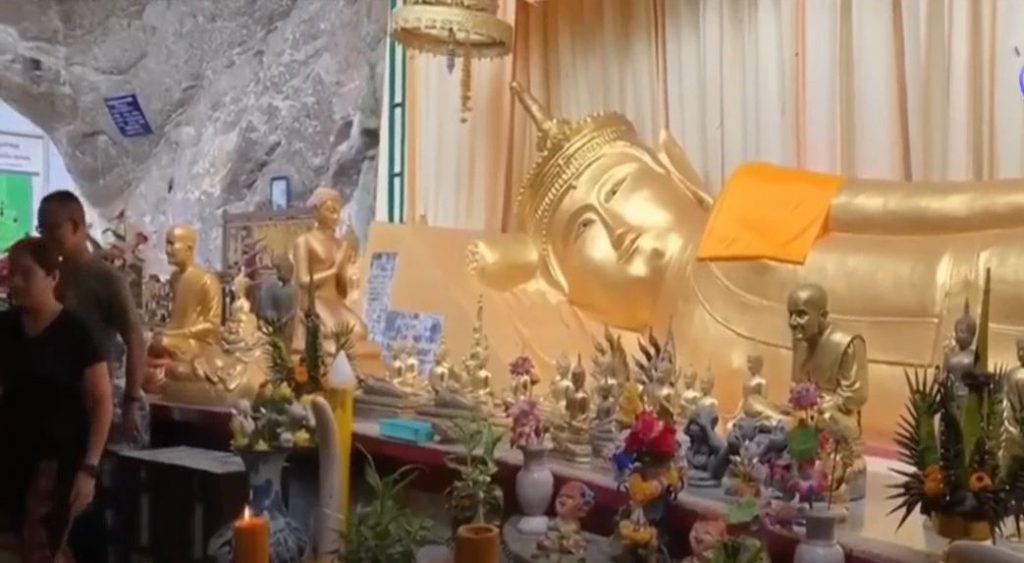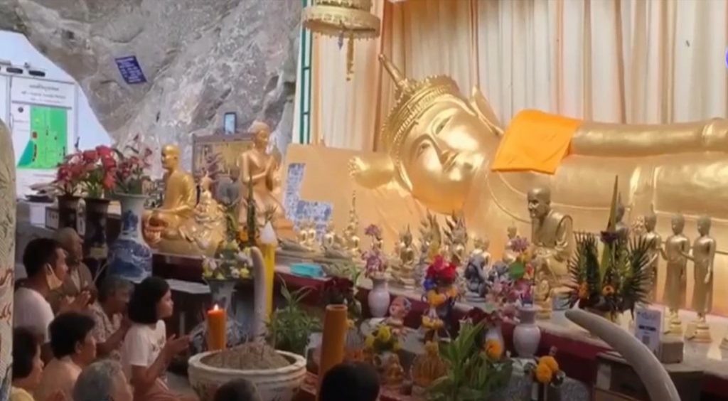 ตรัง 3 ส.ค.-ที่วัดภูเขาทองหมู่ 1 ต.น้ำผุด อ.เมือง จ.ตรัง ประชาชนจากทั่วประเทศ และเชื้อสายมโนราห์ ไปกราบไหว้พระพุทธไสยาสน์ปางปรินิพพาน หรือ พระนอนทรงเทริดมโนราห์อายุกว่า 1,000 ปี ที่มีเพียงองค์เดียวในไทย ความยาวกว่า 8 เมตร และกว้างกว่า 2 เมตร สร้างขึ้นในสมัยศรีวิชัย ปัจจุบันกรมศิลปากรขึ้นทะเบียนเป็นโบราณสถานเรียบร้อยแล้ว และยังสง่างาม เนื่องจากชาวบ้านช่วยกันบูรณะ