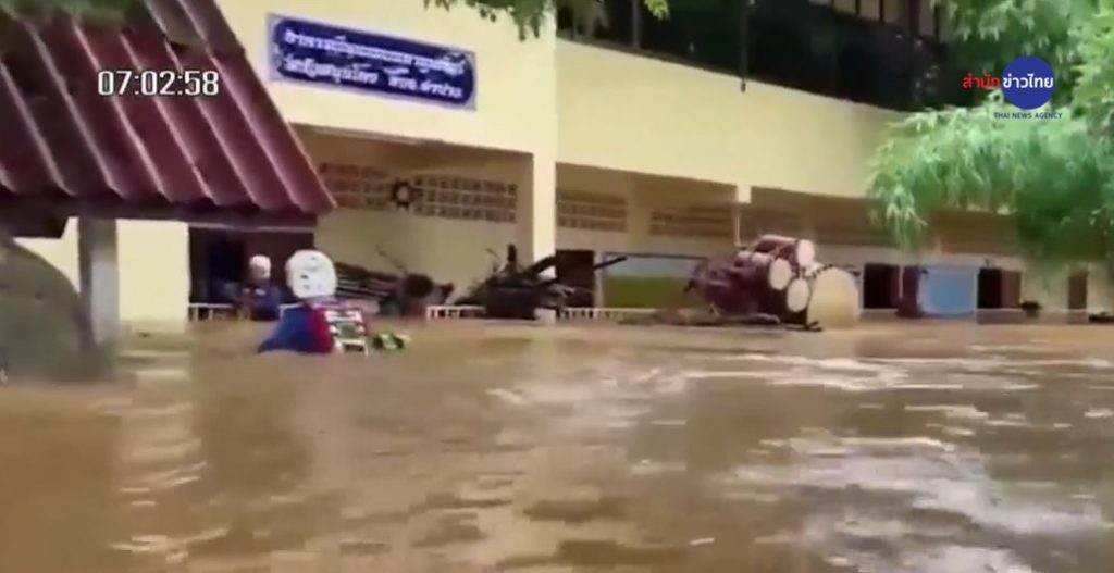 น้ำท่วม อ.เวียงป่าเป้า จ.เชียงราย ยังวิกฤติหนัก ระดับน้ำท่วมสูงเกือบ 1 เมตร ถนนสาย เชียงราย-เชียงใหม่ ตั้งแต่หน้าที่ว่าการอำเภอเวียงป่าเป้า น้ำท่วมถนนยาวประมาณ 1 กิโลเมตร รถเล็กไม่สามารถสัญจรได้ และกระแสน้ำที่ไหลเชี่ยวพัดสะพานที่เชื่อมถนนระหว่างเชียงราย-เชียงใหม่ บริเวณบ้านแม่เจดีย์ ต.แม่เจดีย์ อ.เวียงป่าเป้า ขาด ทหารหน่วยพัฒนาการเคลื่อนที่ 35 จัดส่งอาหารโดยการผูกเชือกแล้วส่งข้ามไป เพื่อบรรเทาความเดือดร้อนชั่วคราว ส่วนบ้านเรือนของประชาชนและพื้นที่ทางการเกษตรยังคงถูกน้ำท่วมสูง