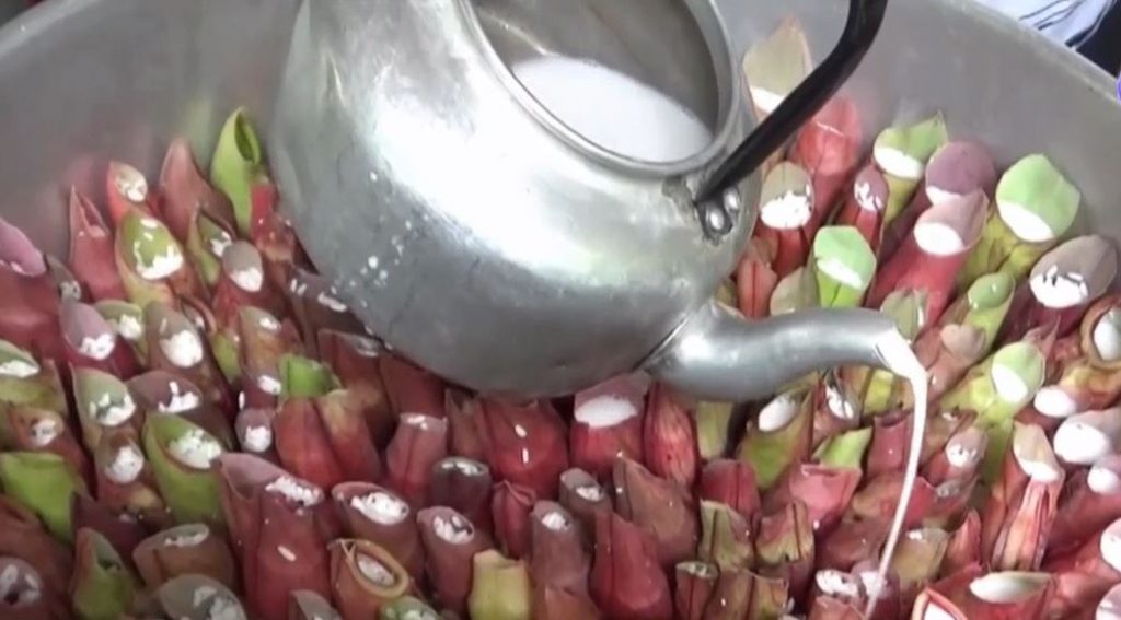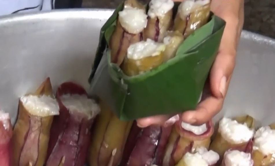 จากนั้นจึงนำไปทำขนม โดยนำข้าวเหนียวดิบมาล้าง แช่น้ำประมาณ 30 นาที แล้วกรอกข้าวเหนียวลงไปในทรงกรม จากนั้นก็หยอดน้ำกะทิสด ที่ผสมน้ำตาลและเกลือไว้แล้วลงไป นำไปนึ่งประมาณ 30 นาที ให้ข้าวเหนียวสุก ก็ทานได้ทันที โดยทานได้ทั้งลูก จะได้รสชาติหวานมันของข้าวเหนียวและน้ำกะทิ โดยราคาขายจำนวน 7 ลูก ราคา 20 บาทเท่านั้น ส่วนใหญ่จะขายประจำที่ตลาดนัดวังยาว เขตเทศบาลนครตรัง รับทำตามออร์เดอร์ที่ลูกค้าสั่งด้วย .-สำนักข่าวไทย