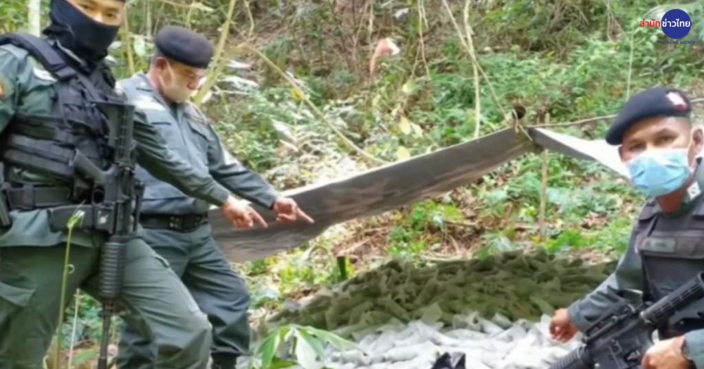 ชุดปฏิบัติการข่าวหน่วยเฉพาะกิจ ตชด.43 ร่วมกับชุดเฝ้าตรวจชายแดน ตชด.437 เข้าตรวจยึดใบกระท่อม น้ำหนักประมาณ 495 กิโลกรัม มูลค่าเกือบ 400,000 บาท ที่ถูกนำมากองรวมกันไว้กองใหญ่ โดยสร้างเพิงชั่วคราวไว้กันฝน ภายในป่าแนวชายแดนไทย-มาเลเซีย ข้างป่าสวนยางพารา หมู่ 5 ต.เขาแดง อ.สะบ้าย้อย จ.สงขลา หลังเจ้าหน้าที่ออกลาดตระเวนตรวจสอบตามแนวชายแดนไทย-มาเลเซีย เพื่อป้องกันการลักลอบขนยาเสพติดและแรงงานต่างด้าวเข้าประเทศ ตามมาตรการป้องกันโรคโควิด-19 เจ้าหน้าที่คาดใบกระท่อมลอตนี้ถูกขนมาจากฝั่งมาเลเซีย นำมากองรวมกันไว้ เพื่อรอกองทัพมดมาขนออกไปกระจายให้ผู้ค้ารายย่อยและผู้เสพ ในพื้นที่ จ.สงขลา และ 3 จังหวัดชายแดนภาคใต้. – สำนักข่าวไทย