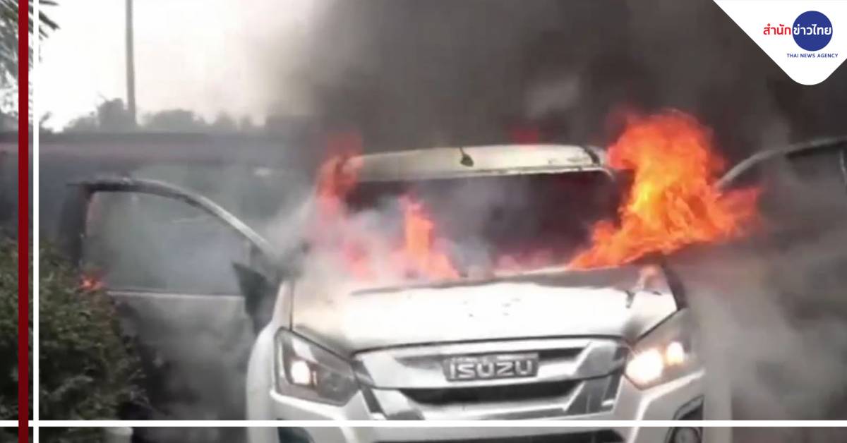 เจ้าหน้าที่และชาวบ้านเร่งฉีดน้ำสกัดเพลิงที่กำลังลุกไหม้รถกระบะสีขาว ที่จอดอยู่ภายในบ้านพัก ต.พานทอง อ.พานทอง จ.ชลบุรี ใช้เวลากว่า 30 นาที จึงควบคุมเพลิงไว้ได้ แต่ไฟไหม้รถกระบะพังเสียหายทั้งคัน