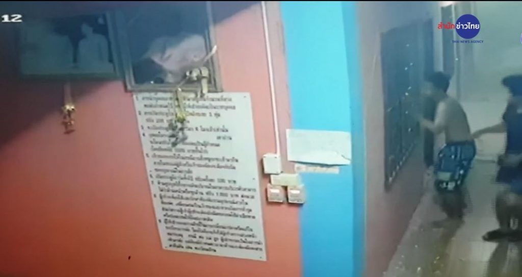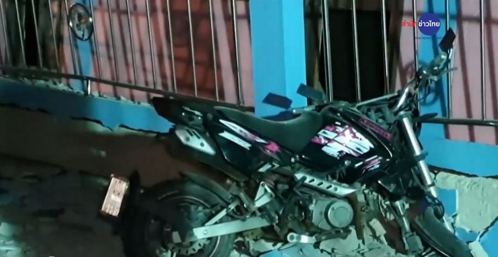 ภาพจากกล้องวงจรปิด หอพักป้าเยี่ยม เลขที่ 125 /10 หมู่ 2 ต.พันท้ายนรสิงห์ อ.เมือง จ.สมุทรสาคร จะเห็นว่าบริเวณด้านหน้าบันทึกภาพขณะหอพักสูง 3 ชั้น ขนาด 30 ห้อง ทรุดตัวลง ทำให้รถจักรยานยนต์ที่จอดอยู่หน้าหอพักเสียหายหลายคัน