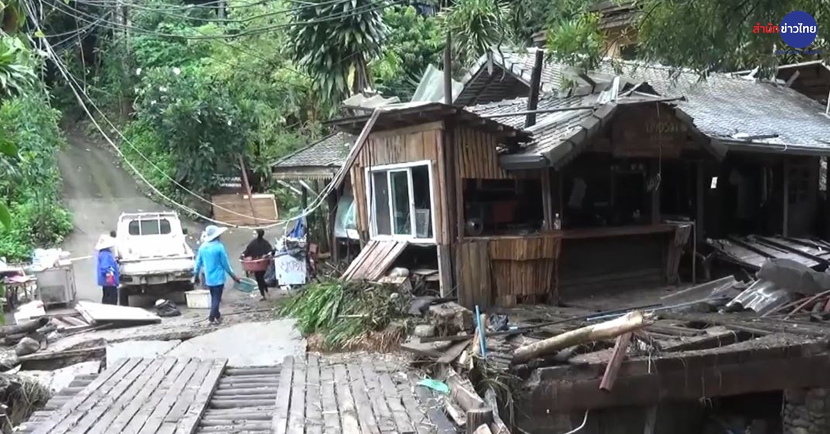 ขณะที่ร้านกาแฟปางร่ม บ้านธารทอง ที่ถูกน้ำป่าพัดร้านพังเสียหาย เจ้าของร้านและคนงานได้ช่วยกันเก็บรื้อเศษซากขยะ กิ่งไม้ ที่ไหลมากับน้ำเข้ามากองอยู่ในร้าน พร้อมเร่งซ่อมแซมร้านให้กลับมาเปิดได้อีกครั้ง คาดว่าต้องใช้เวลาอีกหลายวัน ซึ่งน้ำป่าครั้งนี้รุนแรงในรอบ 10 ปี. – สำนักข่าวไทย
