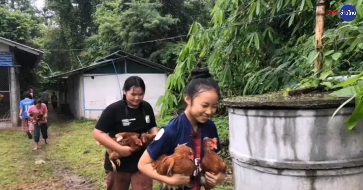 ที่โรงเรือนเลี้ยงไก่ โรงเรียนชุมชนแม่ลาศึกษา ต.แม่ลาหลวง อ.แม่ลาน้อย จ.แม่ฮ่องสอน เด็กพักนอนได้ช่วยกันขนย้ายไก่ สัตว์เลี้ยงกว่า 200 ตัว ที่มีโรงเรือนเลี้ยงไก่ริมน้ำ หลังจากฝนตกหนักต่อเนื่อง และเกิดน้ำป่าทะลักบริเวณลำน้ำลา และลำห้วยแม่เหวย ทำให้ปริมาณน้ำสูงขึ้นเรื่อยๆ และลำห้วยห่างจากโรงเรือนเลี้ยงสัตว์ไม่ถึง 5 เมตร หวั่นน้ำป่าจะทะลักท่วมโรงเรือนเลี้ยงไก่ หากฝนในพื้นที่ยังตกหนักต่อเนื่อง ครูจึงให้เด็กหอพักช่วยกันลำเลียงไก่ไปไว้ในที่ปลอดภัย จนกว่าสถานการณ์น้ำจะเข้าสู่สภาวะปกติ