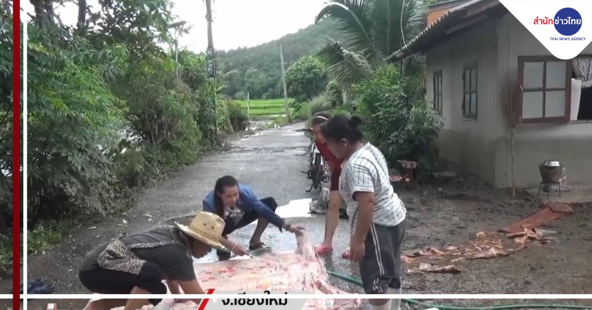 ที่บ้านแม่เตาดิน ต.ห้วยแก้ว อ.แม่ออน จ.เชียงใหม่ หลังน้ำป่าหลากท่วม และเริ่มลดระดับลงแล้วในเช้าวันนี้ ชาวบ้านช่วยกันซักผ้าห่มนวม ทำความสะอาดบ้านเรือนที่เลอะไปด้วยโคลนและทราย แต่นาข้าวของชาวบ้านถูกโคลนและทรายทับถมเสียหายนับสิบไร่ รวมทั้งพื้นที่ปลูกถั่วแระญี่ปุ่น