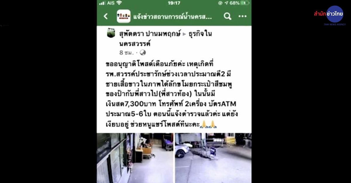 ผู้ใช้ Facebook สุพัตตรา ปานมพฤกษ์ โพสต์คลิปและรูปภาพเตือนภัยสังคม พร้อมระบุข้อความว่า ขออนุญาตเตือนภัย เหตุเกิดที่โรงพยาบาลสวรรค์ประชารักษ์ อ.เมือง จ.นครสวรรค์ ช่วงเวลาประมาณตี 2 วันที่ 22 ส.ค.ที่ผ่านมา ชายเสื้อขาวตามที่ปรากฏในภาพได้ลักขโมยกระเป๋าสีชมพูของป้ากับพี่สาว (พี่สาวท้อง) ในนั้นมีเงินสด 7,300 บาท โทรศัพท์มือถือ 2 เครื่อง และบัตร ATM ประมาณ 5-6 ใบ ตอนนี้แจ้งตำรวจในท้องที่แล้ว แต่ยังเงียบอยู่ จึงอยากให้ช่วยแชร์โพสต์