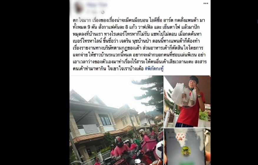 โดยผู้โพสต์ระบุว่า “ตกใจมาก เรื่องของเรื่องน่าจะมีคนมือบอนไอดีชื่อ อาร์ต กดสั่งแพนด้ามาทั้งหมด 9 คัน สั่งกาแฟคันละ 8 แก้ว วาฟเฟิล และเย็นตาโฟ แล้วมาปักหมุดลงที่บ้านเรา ทางไรเดอร์โทรหาก็ไม่รับ แชทไปไม่ตอบ เมื่อกดค้นหาเบอร์โทรหาไลน์ขึ้นชื่อว่า เจตริน……. ตอนนี้ทางแพนด้าก็ต้องทำเรื่องรายงานทางบริษัทตามกฏ ส่วนอาหารก็ตัดสินใจโดยการแจกจ่ายให้ชาวบ้านระแวกนี้หมด อยากจะฝากบอกคนที่ชอบเล่นพิเรนทร์ อย่าเอาเวลาว่างของตัวเองมา ทำเรื่องไร้สาระให้คนอื่นเสียเวลา สงสารคนทำมาหากิน ใจเขาใจเราบ้างเด้อ #พิกัดกะทู้”.-สำนักข่าวไทย