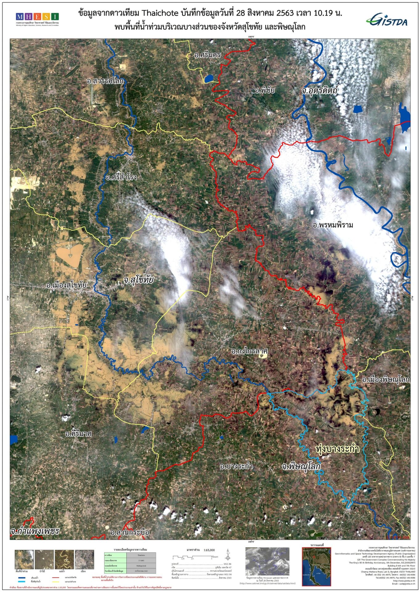28 ส.ค. – GISTDA เปิดภาพไทยโชต มวลน้ำที่ยังคงท่วมขัง ในเขตจังหวัดสุโขทัยและพิษณุโลก ซึ่งส่วนใหญ่เป็นบริเวณที่ราบต่ำและพื้นที่ลุ่มการเกษตรที่เก็บเกี่ยวแล้ว