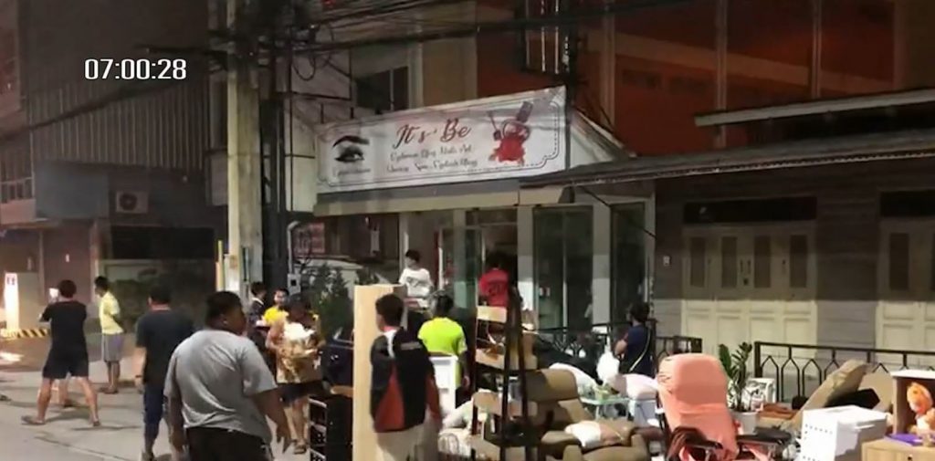 ในที่เกิดเหตุ พบเพลิงกำลังลุกไหม้อย่างรุนแรงและลุกลามอย่างรวดเร็ว เจ้าหน้าที่แบ่งกำลังระดมช่วยเหลือประชาชน ซึ่งมีทั้งเด็กและคนชราออกจากพื้นที่ และใช้รถดับเพลิงไม่ต่ำกว่า 10 คันกระจายกำลังฉีดสกัดรอบด้านตัวโกดัง ซึ่งเป็นโกดังเก็บสินค้าวัตถุไวไฟ เช่น ไม้และสี ขณะที่ด้านหน้าเป็นร้านอาหารเก่า ซึ่งตัวโครงสร้างเป็นไม้ทั้งหมด และด้านข้างจุดเกิดเหตุเป็นอพาร์ทเมนท์
