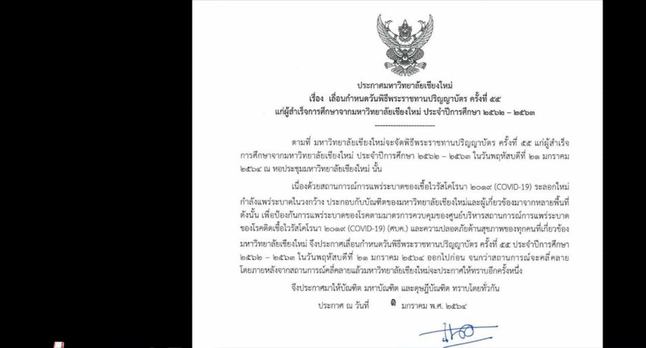 ด้านมหาวิทยาลัยเชียงใหม่ ออกประกาศเลื่อนพิธีรับพระราชทานปริญญาบัตร ในวันที่ 21 มกราคม ออกไปไม่มีกำหนด เนื่องจากโควิด-19 ระลอกใหม่กำลังแพร่ระบาดในวงกว้าง ประกอบกับ บัณฑิตและผู้เกี่ยวข้องมาจากหลายพื้นที่ นอกจากนี้ยังให้จัดการเรียนการสอนและสอบทางออนไลน์เต็มระบบ เพื่อป้องกันโรคด้วย .- สำนักข่าวไทย