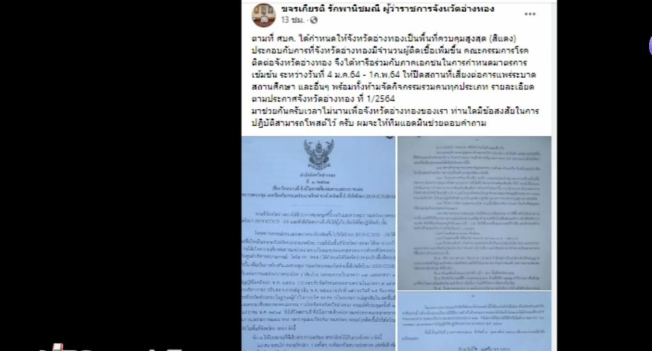 ภูมิภาค 3 ม.ค. -อ่างทองยกระดับการควบคุมโควิด-19 ออกประกาศปิดสถานที่เสี่ยง ส่วนร้านสะดวกซื้อให้ปิดบริการช่วง 23.00-05.00 น. ส่วนยอดผู้ติดเชื้อ จากการตรวจคัดกรองกลุ่มเสี่ยง 1,325 คน มีผู้ติดเชื้อ 12 คน อยู่ระหว่างการสังเกตอาการ 19 คน