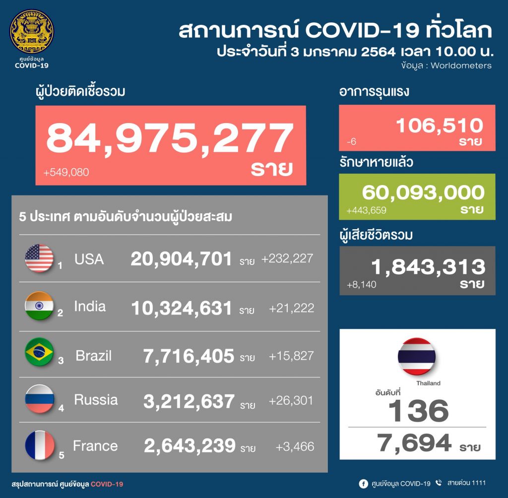 ยอดผู้ติดเชื้อรวม 84,975,277 ราย