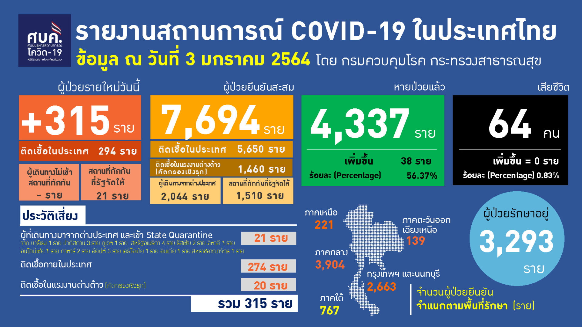 กทม. 3 ม.ค. – ศูนย์ข้อมูล COVID-19 รายงานสถานการณ์การติดเชื้อ COVID-19 ในประเทศไทย วันอาทิตย์ที่ 3 มกราคม 2564 พบผู้ป่วยรายใหม่ 315 ราย ผู้ป่วยยืนยันสะสม 7,694 ราย รักษาหาย 38 ราย รวมหายป่วยแล้ว 4,337 ราย เสียชีวิตสะสม 64 ราย