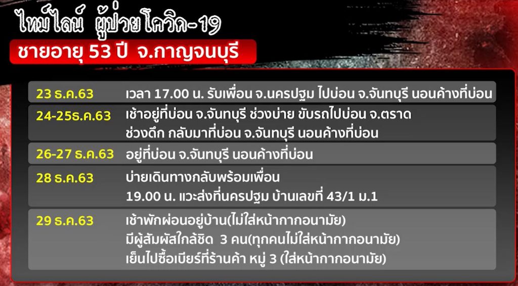 กาญจนบุรี 3 ม.ค. – เปิดไทม์ไลน์ชายวัย 53 ปี ชาว อ.พนมทวน พบเป็นนักพนันเดินสายเข้าบ่อน 2 จังหวัด จันทบุรี-ตราด พร้อมเพื่อนชาวนครปฐม จนติดโควิด-19 ทั้งคู่