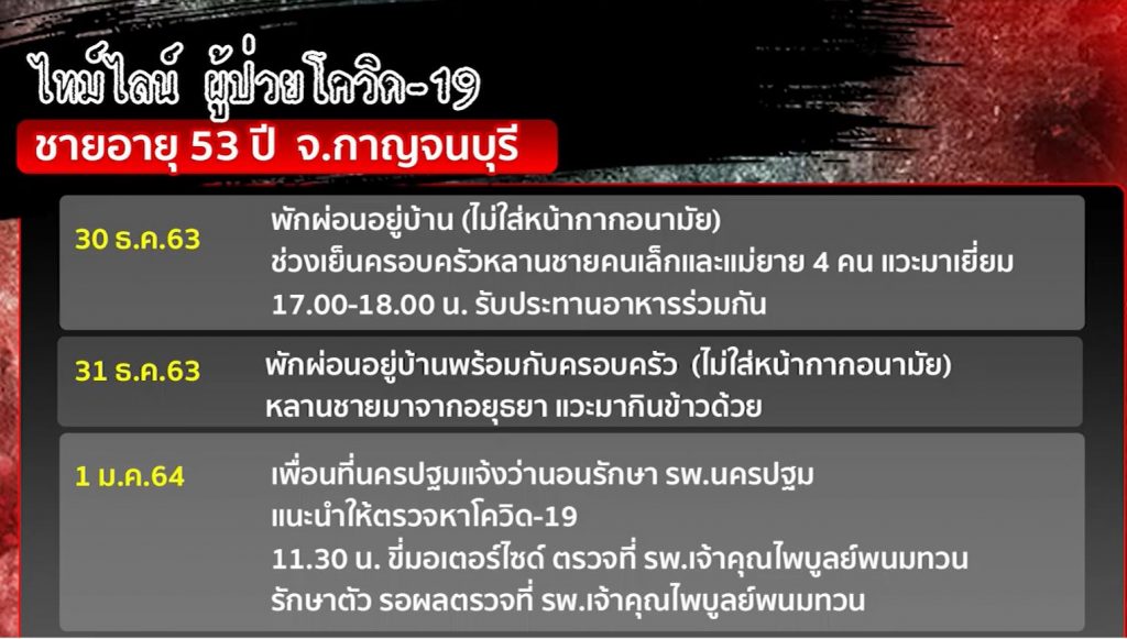• 1 มกราคม 64 เพื่อนที่ จ.นครปฐม โทรศัพท์แจ้งให้ทราบว่านอนรักษาตัวที่ รพ.นครปฐม และแนะนำให้มาตรวจหาเชื้อโควิด-19