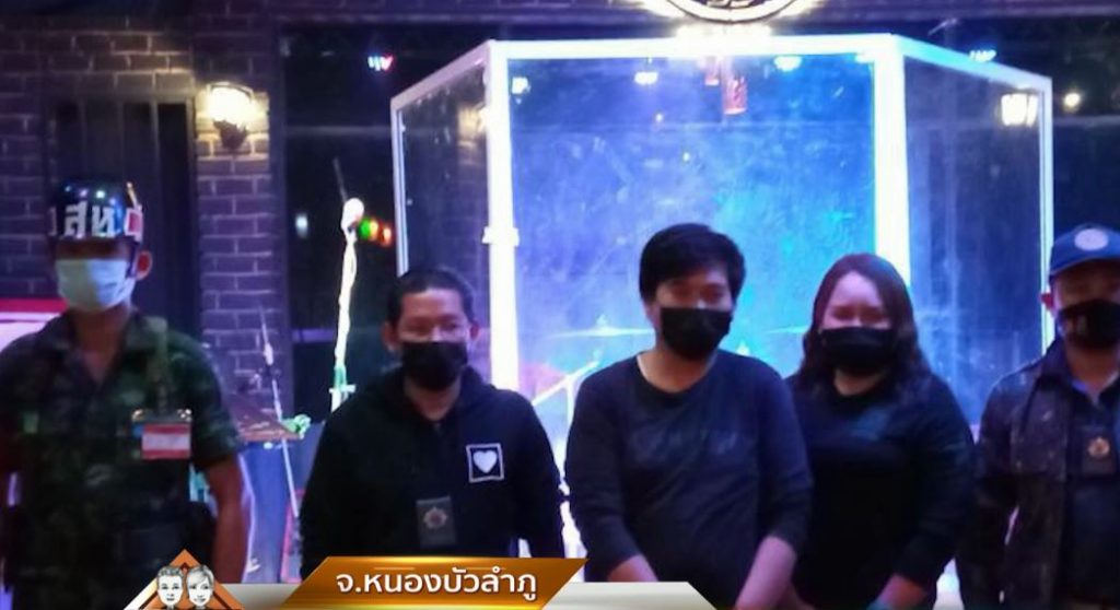 การจับกุมครั้งนี้สุดยอดความรอบคอบ ถ่ายภาพนาฬิกาในมือถือเพื่อเป็นหลักฐานว่าเปิดเกินเวลาแน่นอน (กรมอุทกศาสตร์ กองทัพเรือ) ก่อนเข้าจับกุมนายวัฒชัย อัคนิจ อายุ 32 ปี และ น.ส.กนกพร สีพารา อายุ 27 ปี ผู้จัดการร้านเพลินภิรมย์ ฝ่าฝืนคำสั่งคณะกรรมการควบคุมโรคติดต่อจังหวัดหนองบัวลำภู ซึ่งสั่งให้ปิด 22.00 น. สำหรับสถานประกอบการที่ขายอาหาร เครื่องดื่ม เเละมีดนตรี เปิดร้านแบบผิดประเภท โดยเจ้าหน้าที่ได้ปลอมตัวเป็นนักเที่ยวเข้ามาสังเกตการณ์หลายวันแล้ว และร้านนี้เคยถูกเจ้าหน้าที่บุกจับกุมมาแล้วครั้งหนึ่ง ครั้งนี้เป็นครั้งที่ 2 เมื่อถึงเวลา 22.20 น. พบว่าทางร้านยังเปิดให้บริการอยู่ บนเวทียังแสดงตนตรีสด และลูกค้าในร้านประมาณ 50 คน กำลังเต้นอย่างสนุกสนาน ไม่มีท่าทีจะปิดร้าน เจ้าหน้าที่จึงสั่งหยุดกิจกรรมทั้งหมด