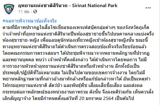 อุทยานเเห่งชาติสิรินาถ โพสต์เฟซบุ๊ก เรื่องผลการพิจารณาข้อเท็จจริง ตามที่มีภาพปรากฏในสื่อโซเชียลของเพจเฟซบุ๊คกลุ่มต่างๆ ของ จ.ภูเก็ต ว่าเจ้าหน้าที่อุทยานแห่งชาติสิรินาถปีนห้องสุขาชายขึ้นไปบนคานกลางแบ่งครึ่งห้องสุขาชาย-หญิง เพื่อแอบดูนักท่องเที่ยวหญิงเข้าห้องสุขาหญิงนั้น ขณะนี้ทางอุทยานแห่งชาติสิรินาถได้ดำเนินการตรวจสอบข้อเท็จจริงเรียบร้อยแล้ว