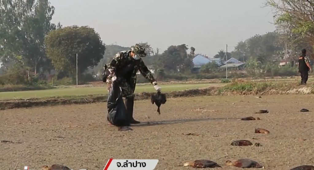 ลำปาง 6 ก.พ. – พบฝูงนกเป็ดแดง ตายเกลื่อนนับร้อยตัว กลางทุ่งนาหลังหมู่บ้านคันทรีวิว อ.เมืองลำปาง บางตัวเริ่มเน่า บางตัวดิ้นทุรนทุรายขึ้นไปตายตามตอซังข้าว เจ้าหน้าที่เก็บซากตรวจสอบ สันนิษฐานนกฝูงนี้ตายเพราะการโปรยสารเคมีลงนาข้าว ไม่ใช่เกิดจากโรคระบาดในนก