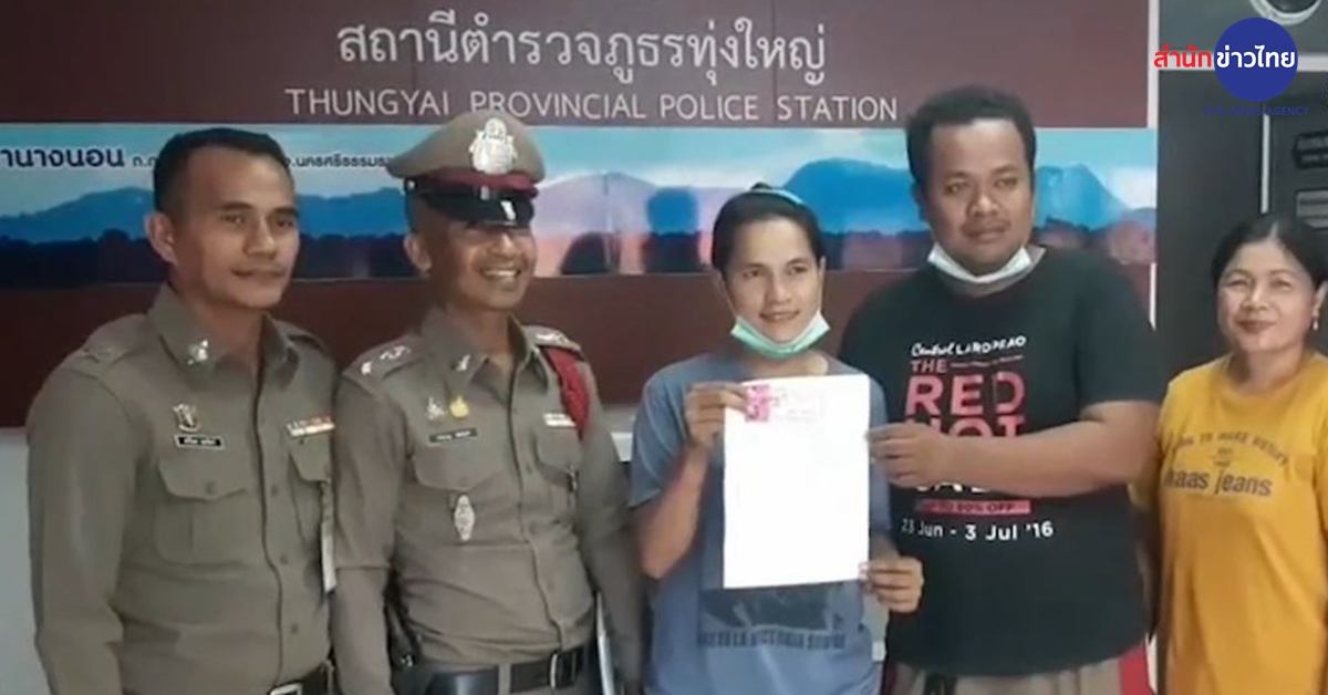 น.ส.สุนี เพชรจันทอง อายุ 38 ปี ชาวบ้านหมู่ 9 ต.บางรูป อ.ทุ่งใหญ่ จ.นครศรีธรรมราช พร้อมนายเกียรติกร สงนุ้ย สามี และลูกสาววัย 2 ขวบเศษ ไปลงบันทึกประจำวันที่ สภ.ทุ่งใหญ่ จ.นครศรีธรรมราช หลังถูกสลากกินแบ่งรัฐบาล รางวัลที่ 1 จำนวน 1 ใบ