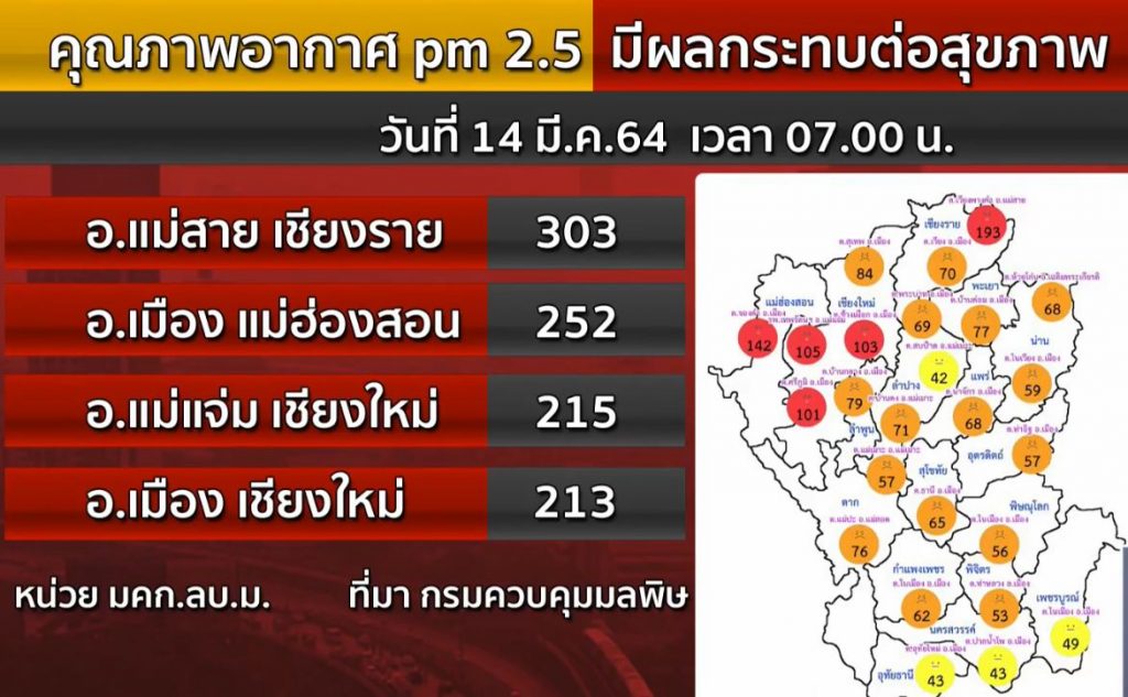 ส่วน จ.เชียงราย ในพื้นที่ ต.เวียงพางคำ อ.แม่สาย พบปริมาณฝุ่น PM2.5 มีค่า 193 ไมโครกรัมต่อลูกบาศก์เมตร ขณะที่ จ.แม่ฮ่องสอน ต.จองคำ อ.เมือง พบปริมาณฝุ่น PM 2.5 มีค่า 142 ไมโครกรัมต่อลูกบาศก์เมตร และในพื้นที่ ต.บ้านดง อ.แม่เมาะ จ.ลำปาง พบปริมาณฝุ่นมีค่า 71 ไมโครกรัมต่อลูกบาศก์เมตร