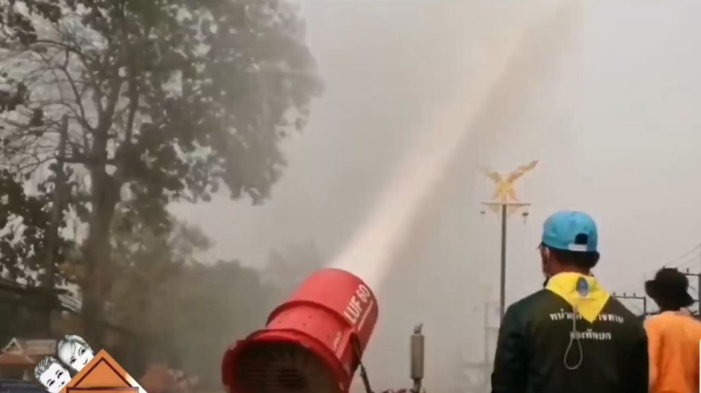 ขณะที่ค่ามลพิษในพื้นที่ จ.เชียงใหม่ ทั้ง 25 อำเภอ สูงถึง 126 จุด เจ้าหน้าที่องค์กรปกครองส่วนท้องต้องนำรถดับเพลิงติดหัวสเปย์ออกฉีดพ่นละอองน้ำ ไปตามท้องถนน เพื่อให้เกิดความชื้นในอากาศ ช่วยดูดซับหมอกควัน