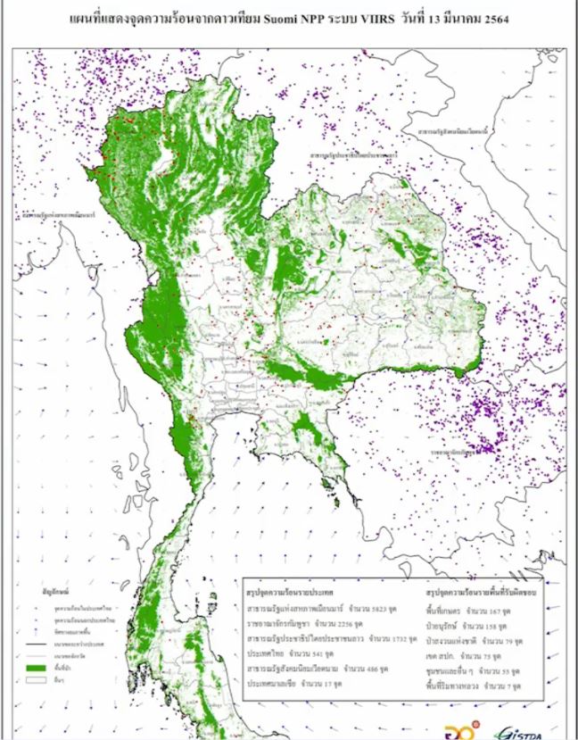 GISTDA สำนักงานพัฒนาเทคโนโลยีอวกาศและภูมิสารสนเทศ (องค์การมหาชน) เผยข้อมูลจากดาวเทียมซูโอมิ เอ็นพีพี เมื่อวันที่ 13 มีนาคมที่ผ่านมา พบจุดความร้อนทั้งประเทศ 541 จุด ค่อนข้างทรงตัวจากเมื่อวาน โดยภาคเหนือยังมีจุดความร้อนมากที่สุดอยู่ที่ 250 จุด ซึ่งมี 3 จังหวัดภาคเหนือยังคงมีจุดความร้อนสูง คือ แม่ฮ่องสอน 94 จุด รองลงมา คือ เชียงใหม่ 45 จุด และนครสวรรค์ 23 จุด ตามลำดับ ส่วนใหญ่พบในพื้นที่เกษตร พื้นที่ป่าอนุรักษ์. – สำนักข่าวไทย