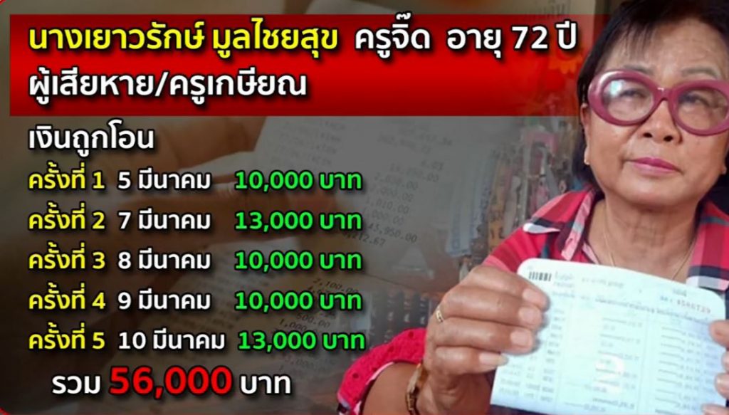 นางเยาวรักษ์ มูลไชยสุข หรือ ครูจิ๊ด อายุ 72 ปี ข้าราชการครูเกษียณอายุราชการ และเป็นครูดีเด่นในโรงเรียนแห่งหนึ่ง ในจังหวัดสกลนคร เปิดเผยว่า พบความผิดปกติในบัญชีเงินธนาคาร มีเงินไหลออกจากบัญชี ซึ่งเป็นบัญชีของธนาคารกรุงไทย สาขาสกลนคร รวม 5 ครั้ง เป็นเงิน 56,000 บาท และเป็นบัญชีที่รองรับการโอนเงินเดือนเกษียณเพียงอย่างเดียว จึงไม่ได้สนใจ จนกระทั่งเงินหายออกจากบัญชีจนหมด เพิ่งทราบเรื่องเมื่อเสียงสัญญาณโทรศัพท์ดังขึ้น ตรวจสอบพบว่าเงินออกจากบัญชีไปหมดแล้ว จึงไปพบผู้บริหารธนาคาร ได้รับคำแนะนำและได้ไปแจ้งความที่ สภ.ตาดโตน มองว่าแม้จะเป็นเงินไม่ได้มากมาย แต่ก็ได้รับความเดือดร้อนเช่นกัน สงสารนายบุญสวน จันใด อายุ 68 ปี ซึ่งเป็นผู้เสียหายอีกคนในจังหวัดเดียวกันที่สูญเงิน 150,000 บาท พบว่ามีความเดือดร้อนมากเช่นกัน เพราะต้องเลี้ยงดูลูกชายพิการอีกคน ไม่มีรายได้ใดๆ มีเพียงเบี้ยคนชราและคนพิการเท่านั้น ซึ่งเป็นเงินที่ช่วยประทังชีวิตของครอบครัว