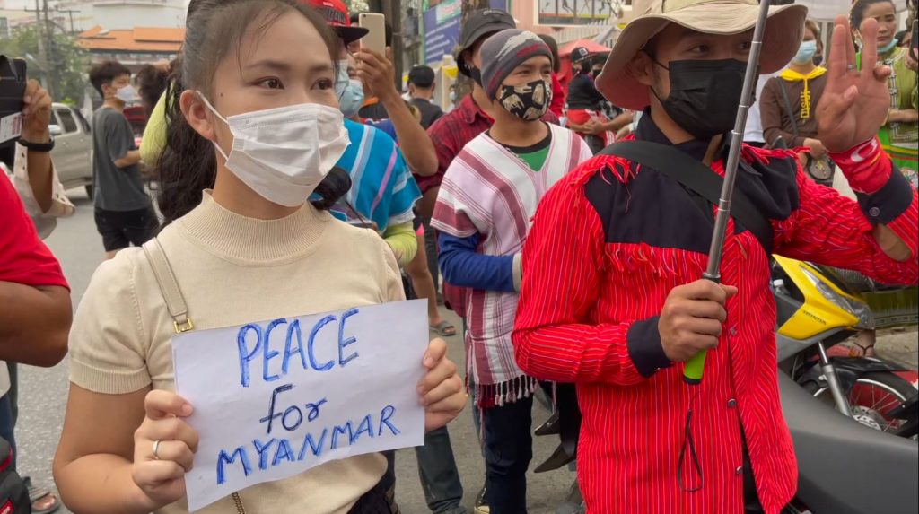 เชียงใหม่ 4 เม.ย. – ชาวเมียนมาหลายร้อยคนรวมตัวส่งกำลังใจถึงเพื่อนร่วมชาติ ร่วมร้องเพลงเพื่อเสรีภาพต่อต้านรัฐบาลทหาร