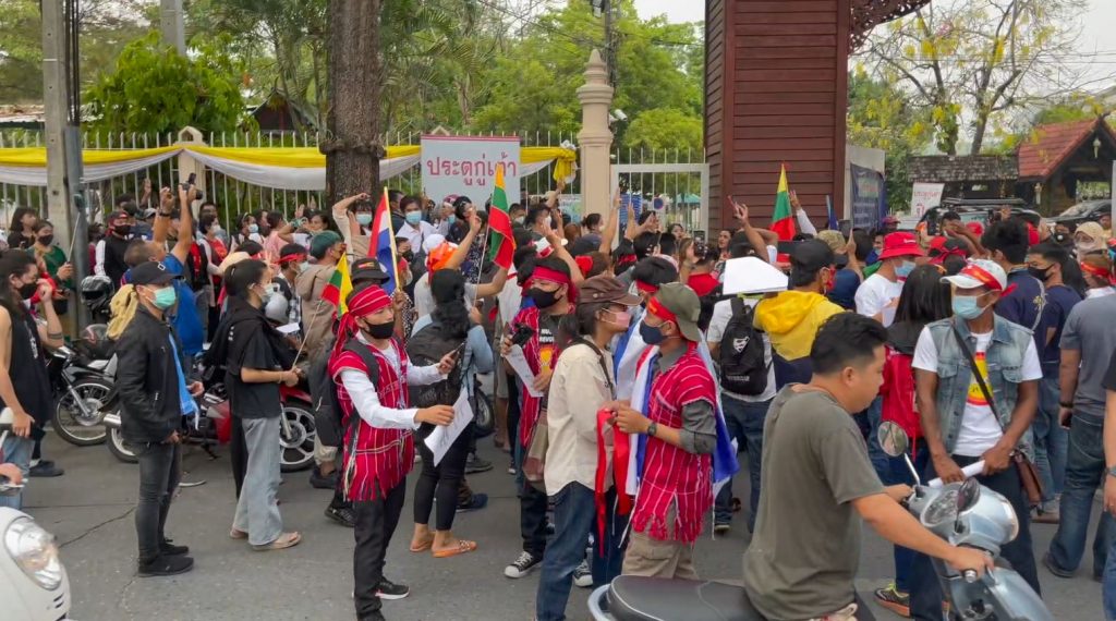 เมื่อเวลา 16.00 น. ที่ผ่านมา กลุ่มชาวเมียนมาที่อาศัยอยู่ในประเทศไทยหลากหลายเชื้อชาติ ทั้งชาวไทยใหญ่ ปะหล่อง กะเหรี่ยง คะฉิ่น อารกัน หลายร้อยคนรวมตัวกันที่หน้าสนามกีฬาเทศบาลนครเชียงใหม่ แสดงพลังต่อต้านรัฐประหารในเมียนมา โดยกลุ่มผู้ชุมนุมได้ร่วมกันร้องเพลง กะบามะเจ่บู ที่สื่อความหมายถึงการเรียกร้องเสรีภาพ ส่งกำลังใจไปถึงที่น้องชาวเมียนมาที่กำลังร่วมกันต่อสู้อำนาจเผด็จการของรัฐบาลทหารพม่า พร้อมร่วมกันเปิดกล่องรับบริจาคเงินเพื่อรวบรวมส่งไปช่วยเหลือพี่น้องกลุ่มชาติพันธุ์ต่าง ๆ ที่กำลังได้รับความเดือดร้อนจากการโจมตีของรัฐบาลทหารพม่าตามแนวชายแดนหลายจุด