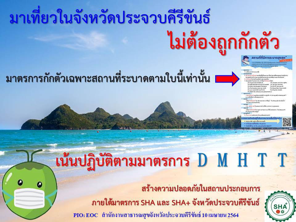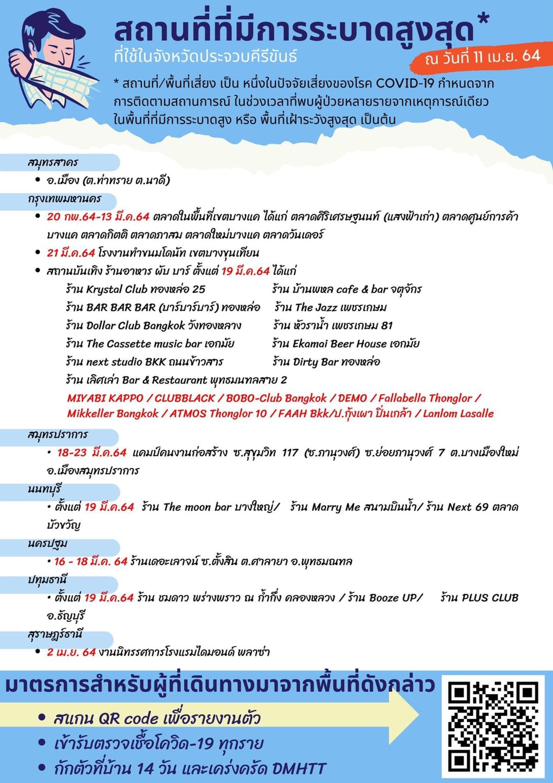 ส่วนมาตรการเกี่ยวกับการเดินทางเข้ามาท่องเที่ยวใน จ.ประจวบคีรีขันธ์ ไม่ต้องถูกกักตัว 14 วัน ยกเว้นผู้ที่เดินทางมาจากสถานที่ที่มีการระบาดใน 7 จังหวัด ประกอบด้วย 1. จ.สมุทรสาคร ที่ ต.ท่าทราย ต.นาดี อ.เมือง 2. กรุงเทพมหานคร ระหว่างวันที่ 20 ก.พ.-13 มี.ค.64 พื้นที่ตลาดในเขตบางแค วันที่ 21 มี.ค. โรงงานทำขนมโดนัท เขตบางขุนเทียน สถานบันเทิง ร้านอาหาร ผับบาร์ ตั้งแต่วันที่ 9 มี.ค.63 ประกอบด้วย ร้านอาหารต่างๆ ในเขตทองหล่อ เขตวังทองหลาง เขตเอกมัย ถ.ข้าวสาร พุทธมณฑลสาย 2 จตุจักร เพชรเกษม ป.กุ้งเผา ปิ่นเกล้า เป็นต้น 3. จ.สมุทรปราการ ระหว่างวันที่ 18-23 มี.ค.64 บริเวณแคมป์คนงานก่อสร้าง ซ.สุขุมวิท 117 ซ.ภานุวงศ์ ซ.ภานุวงศ์ 7 ต.บางเมืองใหม่ อ.เมืองสมุทรปราการ 4. จ.นนทบุรี ตั้งแต่วันที่ 19 มี.ค.64 ร้านอาหารบางใหญ่ สนามบินน้ำ ตลาดบัวขวัญ 5. จ.นครปฐม ระหว่างวันที่ 16-18 มี.ค.64 ร้านเดอะเลาจน์ ซ.ตั้งสิน ต.ศาลายา อ.พุทธมณฑล 6. จ.ปทุมธานี ตั้งแต่วันที่ 19 มี.ค.64 ร้านชมดาว พร่างพราว ณ ก้ำกึ่ง คลองหลวง / ร้าน booze up / ร้าน plus club อ.ธัญบุรี 7. จ.สุราษฎร์ธานี วันที่ 2 เม.ย.64 งานนิทรรศการโรงแรมไดมอนด์พลาซ่า