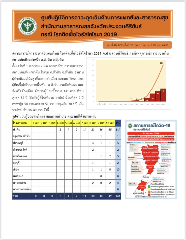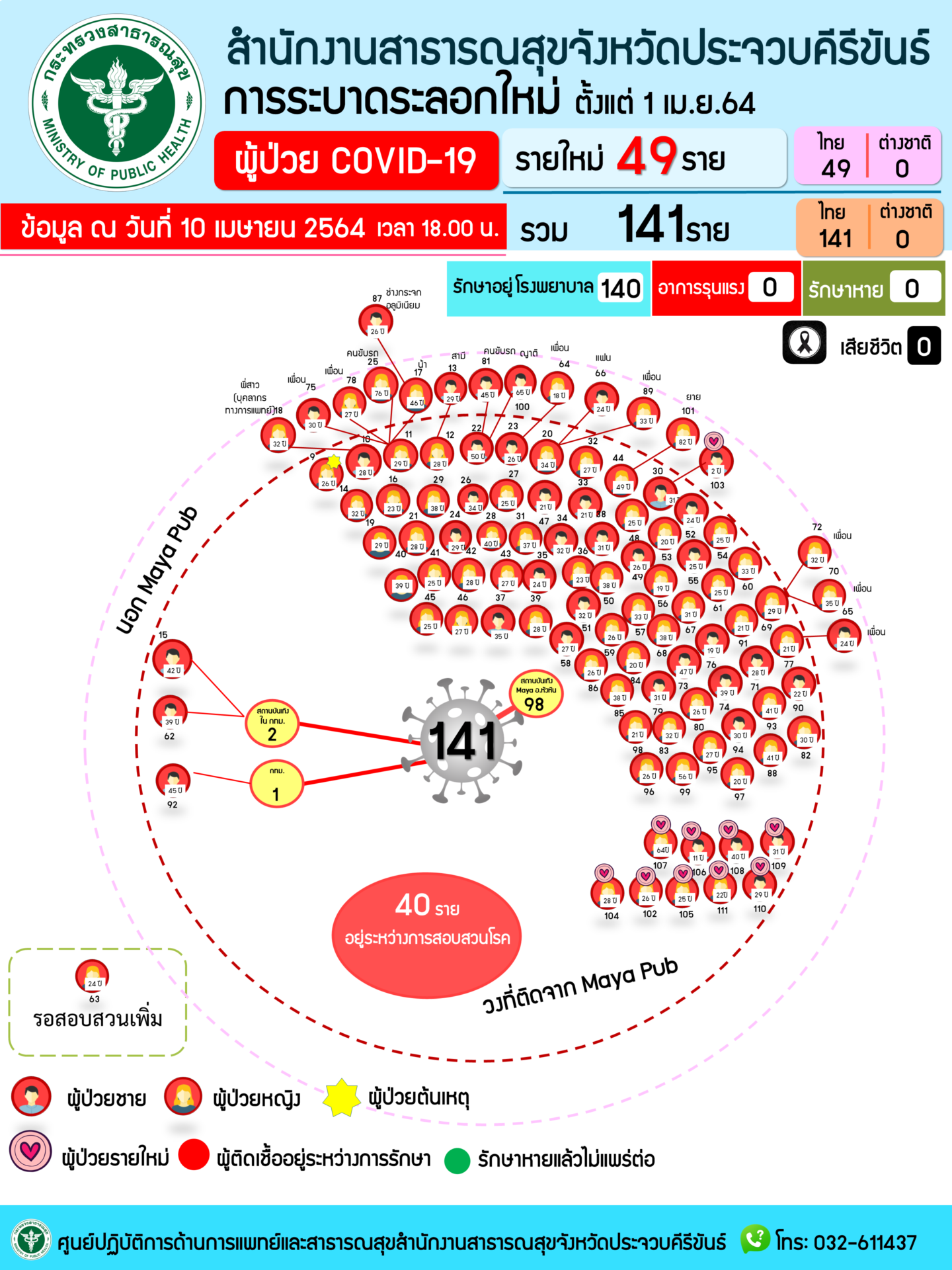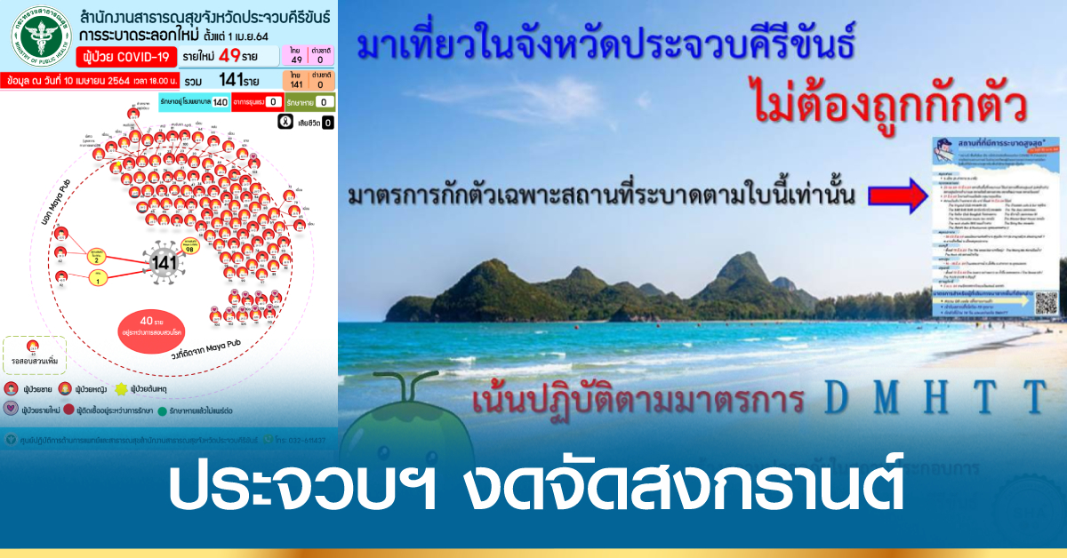 วันนี้ (11 เม.ย.64) ผู้สื่อข่าวรายงานเกี่ยวกับกิจกรรมประเพณีสงกรานต์ในปีนี้ งดทุกกิจกรรม ไม่มีพิธีรดน้ำ ขอพรต่างๆ เนื่องจากสถานการณ์การแพร่ระบาดโควิด-19 ที่ระบาดขึ้นรอบ 3 ในหลายพื้นที่ หลายจังหวัด สำหรับในส่วนของจังหวัดประจวบคีรีขันธ์ สถานการณ์การระบาดระลอกใหม่ของโรคติดเชื้อไวรัสโคโรนา 2019 สาเหตุการระบาดมาจากสถานบันเทิงต่างๆ โดยเฉพาะไทม์ไลน์จากสถานบันเทิงในเขต อ.หัวหิน ตั้งแต่วันที่ 1 เมษายน 2564 พบมีจำนวนผู้ป่วยเพิ่มสูงขึ้นอย่างต่อเนื่อง และยังพบไทม์ไลน์ผู้ติดเชื้อไปหลายพื้นที่ใน อ.หัวหิน รวมถึงอำเภออื่นๆ และจังหวัดข้างเคียง โดยมียอดผู้ป่วยทั้งหมด ณ วันที่ 11 เม.ย.64 จำนวน 141 ราย พบอายุสูงสุด 82 ปี (สัมผัสกับผู้ที่ไปเที่ยวผับ) อายุน้อยที่สุด 2 ปี แบ่งเป็นเพศหญิง 90 ราย เพศชาย 51 ราย อายุเฉลี่ย 30 ปี เป็นรายใหม่จำนวน 49 ราย เข้ารักษาตัวอยู่ใน รพ.หัวหิน 114 ราย รพ.กรุงเทพหัวหิน 1 ราย รพ.ปราณบุรี 5 ราย รพ.ค่ายธนะรัชต์ 2 ราย รพ.สามร้อยยอด 3 ราย รพ.กุยบุรี 2 ราย รพ.ประจวบฯ 10 ราย และ รพ.บางสะพาน 4 ราย รวมเป็น 141 ราย