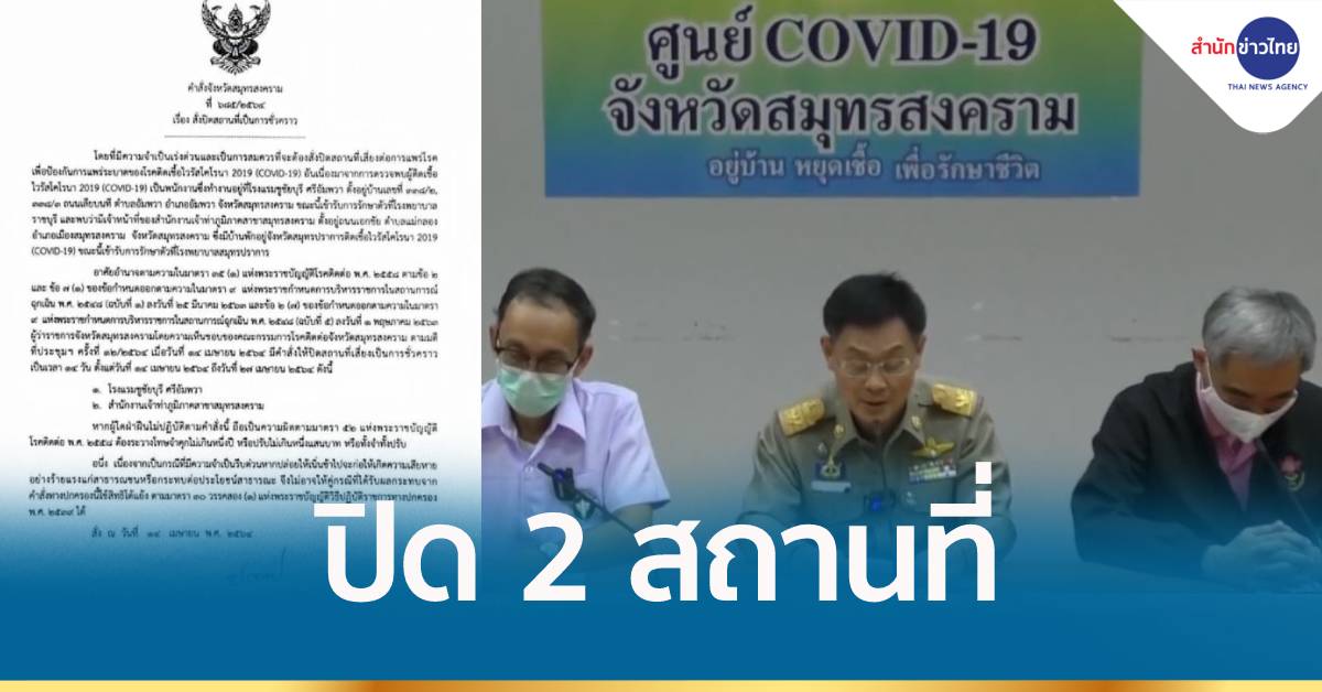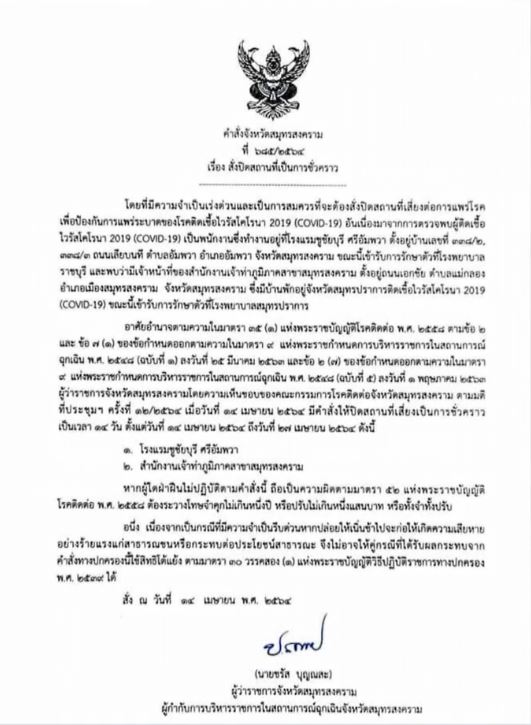 ผู้ว่าฯ สมุทรสงคราม ลงนามสั่งปิด 2 สถานที่ ตามที่คณะกรรมการโรคติคต่อจังหวัดสมุทรสงครามเสนอ หลังพบผู้ติดเชื้อที่โรงแรมชูชัยบุรี ศรีอัมพวา และที่สำนักงานเจ้าท่าภูมิภาคสาขาสมุทรสงคราม