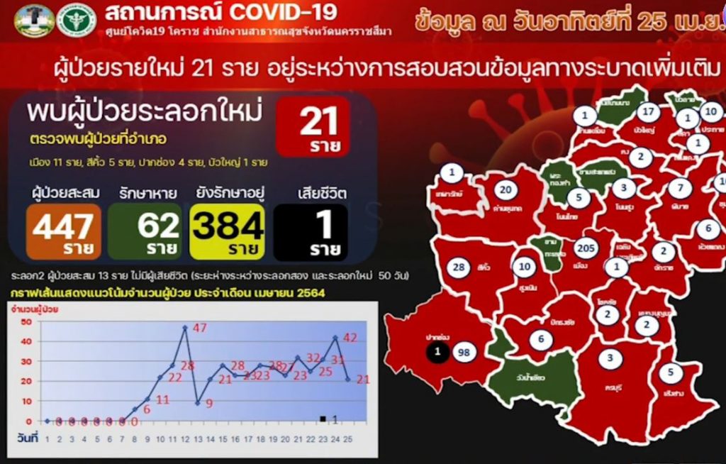 นครราชสีมา 25 เม.ย. – ผู้ว่าฯ นครราชสีมา ประกาศสวมหน้ากากอนามัย 100% ปิด 31 สถานที่เสี่ยง งานศพไม่เกิน 20 คน ขณะที่ยอดป่วยโควิดสะสม 447 ราย