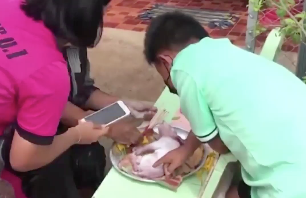 แต่สภาพร่างกายอ่อนแอ เนื่องจากแผ่นกะโหลกไม่หุ้มทั้งหมด ทำให้สมองผิดปกติ ไม่ยอมกินนม เอาแต่นอนซม แต่ยังมีลมหายใจอยู่ ยังไม่ตายเดินไม่ได้ แต่ยังดิ้นไปมาได้ ชาวบ้านหลายคนพากันมาดูลูกหมูประหลาด ไม่เคยพบเคยเห็น และที่สำคัญพากันขอโชคลาภกันตามความเชื่อ นำแป้งมาทาถูกลูบๆ คลำๆ หวังจะได้เลขเด็ดงวดนี้