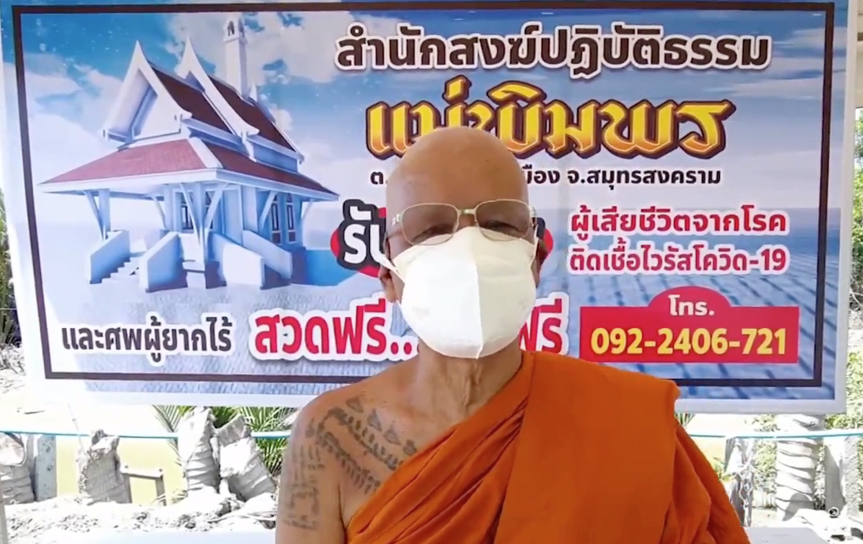 ที่สำนักปฏิบัติธรรมแม่พิมพร สาขาวัดอินทาราม ต.คลองโคน อ.เมือง จ.สมุทรสงคราม พระใบฎีกามงคล ปัญญาทีโป เจ้าสำนักปฏิบัติธรรมแม่พิมพร ได้จัดพิธีเผาผีต้นกล้วยตามความเชื่อ หลังจากพระครูพิศิษฏ์ประชานาถ หรือหลวงพ่อแดง นันทิโย รองเจ้าคณะอำเภออัมพวาและเจ้าอาวาสวัดอินทาราม ซึ่งเป็นผู้ริเริ่มก่อตั้งสำนักปฏิบัติธรรมแม่พิมพร ได้สร้างเตาเผาศพมูลค่ากว่า 3 ล้านบาท เพื่อรับเผาศพผู้เสียชีวิตจากโควิด-19 ฟรีไม่มีค่าใช้จ่าย เป็นสาขาที่ 2 จากนั้นเป็นพิธีเผาผีต้นกล้วย โดยการนำต้นกล้วยหอมทอง มาตกแต่งเป็นศพผู้เสียชีวิตชื่อ “ตากล้วย หอมทอง อายุ 120 ปี” และจัดพิธีครบ ด้วยการให้คณะสงฆ์ 4 รูปที่สวมชุด PPE สีเหลือง ทอดผ้าไตรบังสุกุล และกรวดน้ำอุทิศส่วนกุศลให้เจ้าของที่ดิน และคณะสงฆ์ 4 รูป พร้อมสัปเหร่อสวมชุด PPE ยกร่างตากล้วยลงโลง เคลื่อนศพต้นกล้วยเข้าเตาเผา เป็นอันเสร็จพิธี
