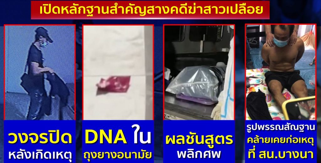 หลังเกิดเหตุ ตำรวจได้หาพยานหลักฐานเพิ่มเติมทั้งภาพจากวงจรปิดและหลักฐานทางนิติวิทยาศาสตร์ โดยเฉพาะ DNA จากถุงยางอนามัยที่พบในห้องพักผู้ตาย และผลชันสูตรที่ระบุว่าผู้ตายเสียชีวิตจากการขาดอากาศหายใจ จึงทำให้มั่นใจได้ว่าชายต้องสงสัยรายนี้มีส่วนเกี่ยวข้องกับตาย และยังทราบเบาะแสว่าชายคนนี้มีรูปพรรณสัณฐานคล้ายกับคนร้ายที่เคยก่อเหตุลักษณะเดียวกันในพื้นที่ สน.บางนา