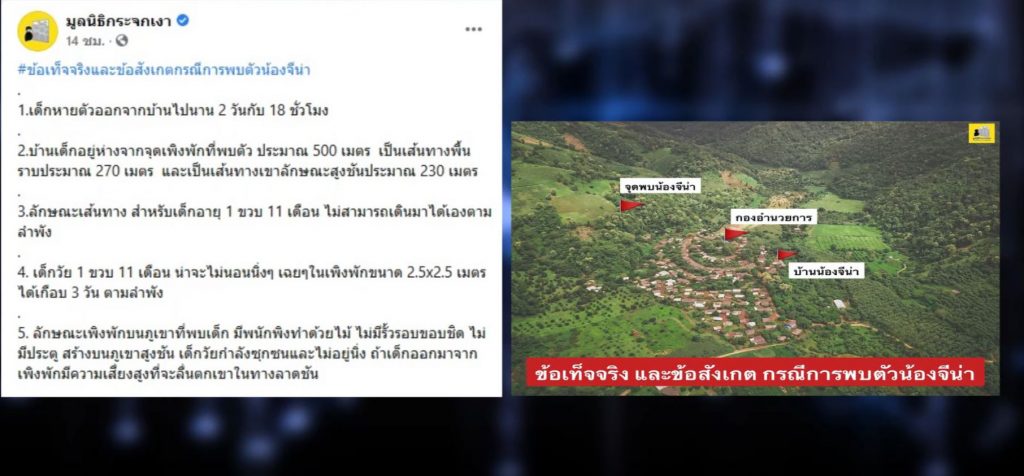 ข้อสังเกตนี้มูลนิธิกระจกเงาได้โพสต์ 10 ข้อเท็จจริงและข้อสังเกตการพบตัวน้องจีน่า ตอกย้ำให้สังคมร่วมจับตาคดีนี้ไว้ว่า เด็กหายตัวออกจากบ้านไปนาน 2 วัน 18 ชั่วโมง บ้านเด็กอยู่ห่างจากจุดเพิงพักที่พบตัวประมาณ 500 เมตร เป็นเส้นทางพื้นราบประมาณ 270 เมตร และเป็นเส้นทางเขาลักษณะสูงชั้นประมาณ 230 เมตร ลักษณะเส้นทาง สำหรับเด็กอายุ 1 ขวบ 11 เดือน ไม่สามารถเดินมาได้เองตามลำพัง และในวัยที่ซุกซน ไม่น่าจะนอนนิ่งๆ ในเพิงพักขนาด 2.5×2.5 เมตร ได้เกือบ 3 วันตามลำพัง ประกอบกับลักษณะเพิงพักที่พบน้องทำด้วยไม้ ไม่มีรั้วรอบขอบชิด สร้างบนเขา ถ้าเด็กเดินออกมาเสี่ยงสูงที่จะลื่นตกเขา นอกจากนี้หมู่บ้านตั้งอยู่ไกลจากถนนใหญ่ 10 กิโลเมตร เส้นทางส่วนใหญ่ค่อนข้างเปลี่ยว มีบ้านคนน้อย หากเลือกพาเด็กออกนอกพื้นที่ สามารถทำได้โดยง่าย และที่ผ่านมาประเทศไทยไม่เคยพบข้อมูลการลักพาตัวเด็กเพื่อบูชายัญ แต่ส่วนใหญ่มีวัตถุประสงค์เพื่อกระทำทางเพศ เพื่อความเสน่หาเอาไปเลี้ยงดู เพื่อเอาไปเร่ร่อนขอทาน และสร้างสถานการณ์โดยคนในครอบครัวหรือคนที่รู้จักหรือมีความขัดแย้งกับคนในครอบครัว ซึ่งกรณีการหายตัวไปของน้องจีน่า อาจมีข้อเท็จจริงอื่นที่ยังไม่ปรากฏในตอนนี้