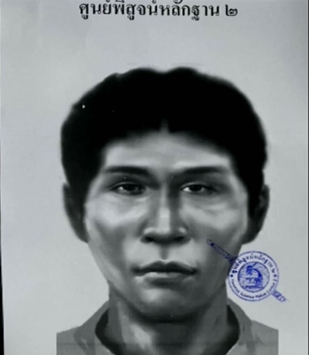 นี่เป็นภาพสเก็ตช์ จากการรวบรวมคำให้การของปากคำพยานและพยานหลักฐานแวดล้อมต่าง ๆ ทั้งภาพจากกล้องวงจรปิดรอบบริเวณที่เกิดเหตุ ลักษณะผู้ต้องสงสัยเป็นชายผิวดำแดง ผมหยักศก อายุประมาณ 40 ปี พูดจาสำเนียงภาษาอีสาน จากคำให้การของการสอบปากคำพยานและภาพจากกล้องวงจรปิดในบริเวณใกล้ที่เกิดเหตุตรงกัน พบเห็นชายต้องสงสัยเดินวนเวียนอยู่ใกล้ที่เกิดเหตุ